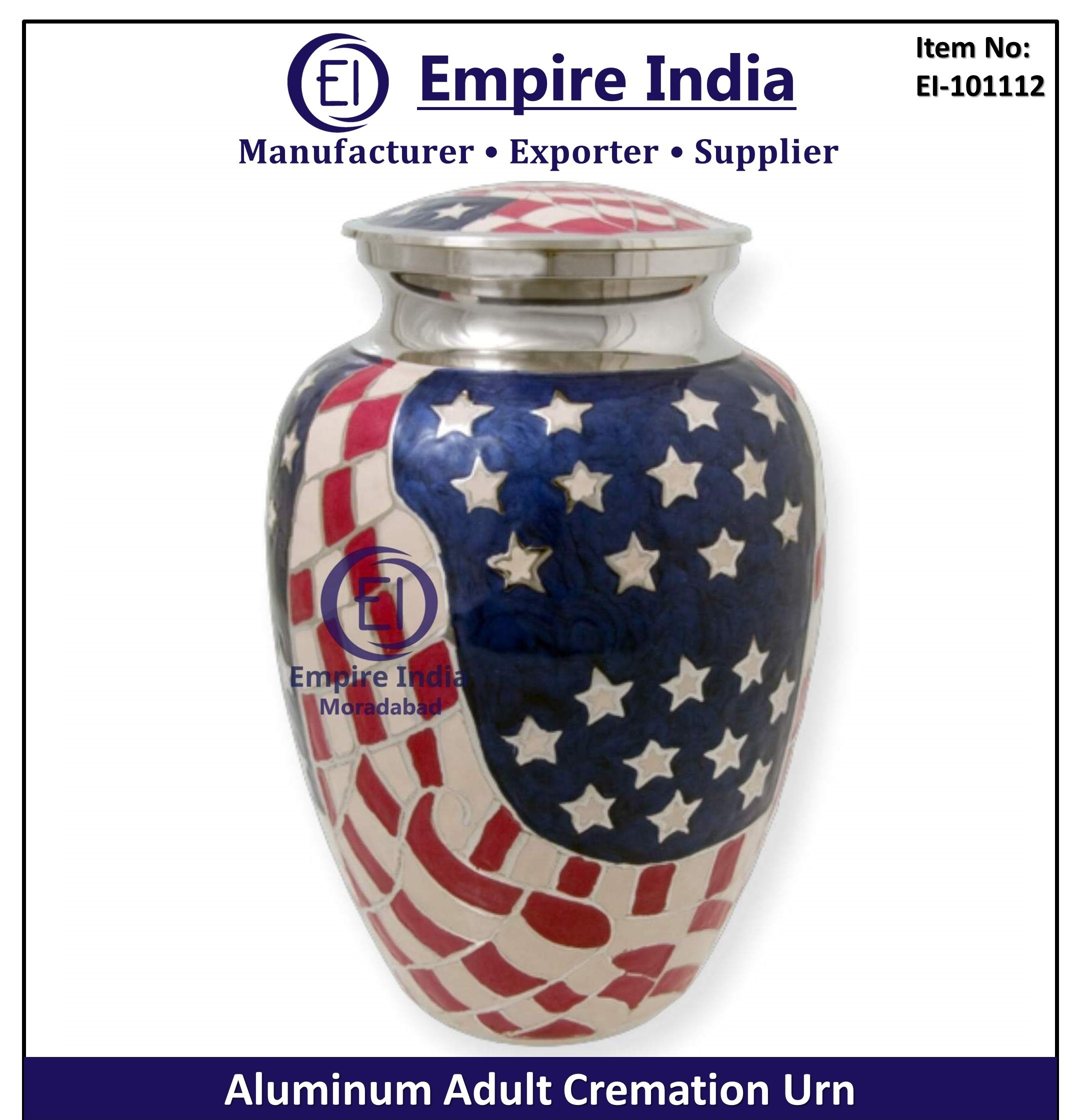 Honor the memory of loved ones with this beautifully crafted Aluminum Adult Cremation Urn featuring a vibrant American flag enamel design. Produced by Empire India, Moradabad, this urn reflects national pride with durable construction and a premium finish. Ideal for funeral homes, patriotic memorials, veteran tributes, and families seeking meaningful remembrance.