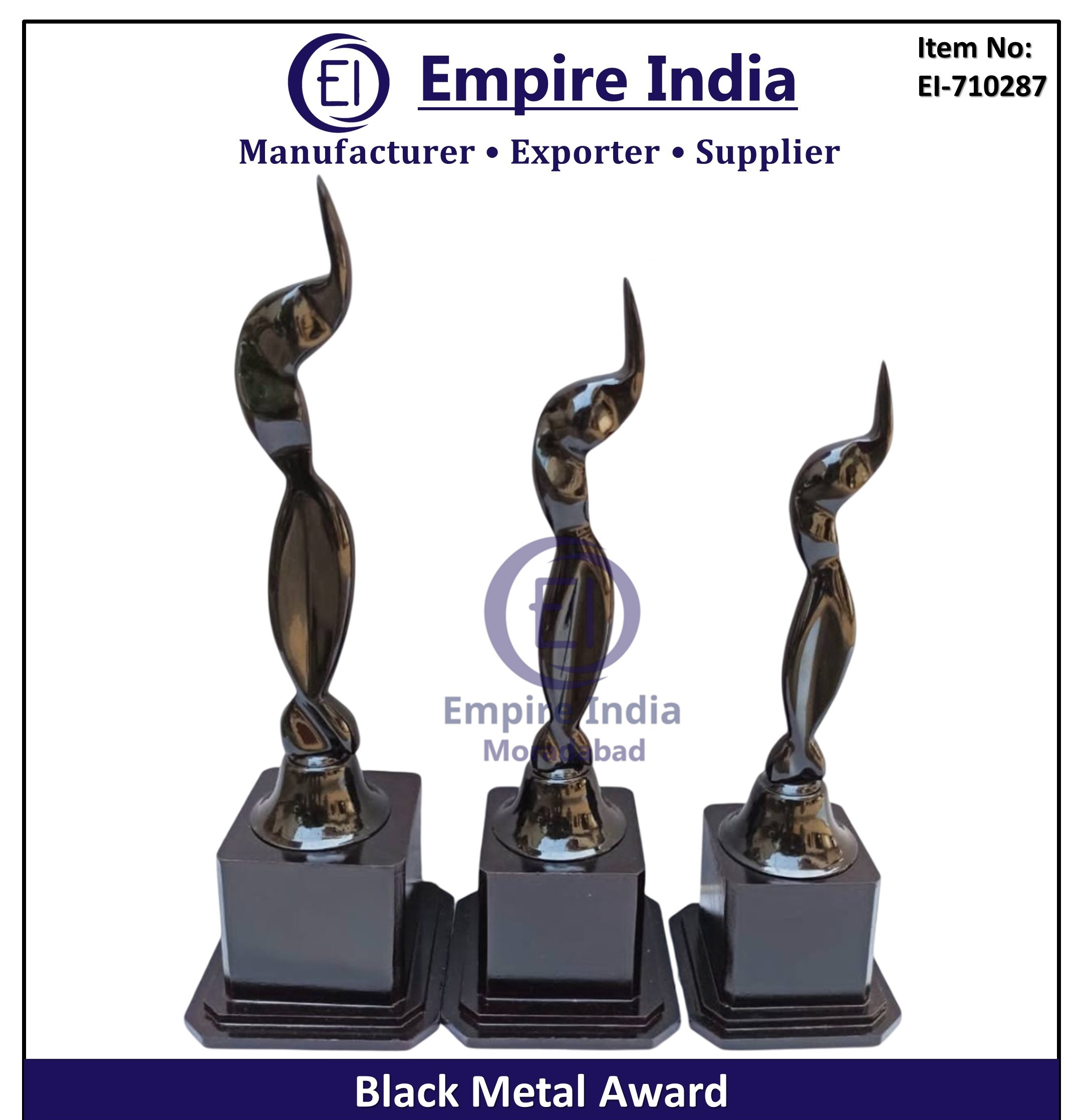 Celebrate excellence with this Modern Black Metal Award Trophy Set by Empire India, Moradabad. Featuring a striking abstract design on a glossy black base, these trophies are ideal for corporate recognition, achievement awards, creative competitions, and premium events.