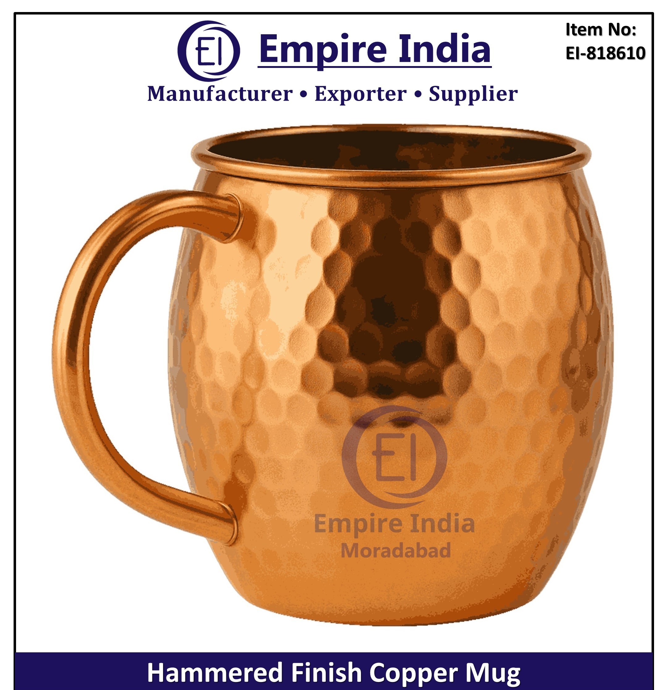 Enjoy style and wellness with this Hammered Finish Copper Mug from Empire India, Moradabad. Expertly crafted with a classic hammered texture, this mug is perfect for serving water, cocktails, juice, or specialty drinks. Its timeless design brings elegance and traditional health benefits to homes, bars, hotels, restaurants, and gifting.