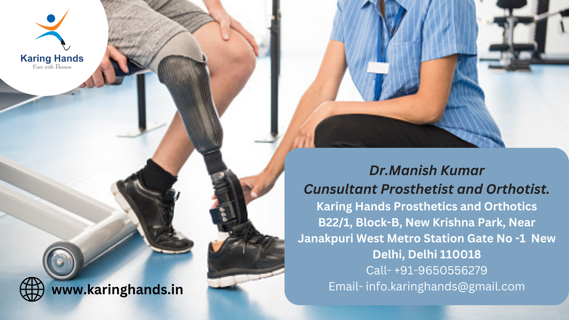 Karing Hands Prosthetics and Orthotics (+91-9650556279) is a healthcare company that specializes in providing prosthetic and orthotic services to individuals with limb loss or limb impairment. The company is based in New Delhi India. The company uses advanced technology and techniques to create prosthetic and orthotic devices that are comfortable, durable, and functional. They work closely with each patient to understand their unique needs and goals, and to develop a personalized treatment plan that meets their specific requirements. Karing Hands Prosthetics and Orthotics also provides ongoing support and maintenance for their devices, ensuring that they continue to function properly. Overall, Karing Hands Prosthetics and Orthotics is a leading provider of prosthetic and orthotic services that is dedicated to improving the lives of individuals with limb loss or limb impairment.