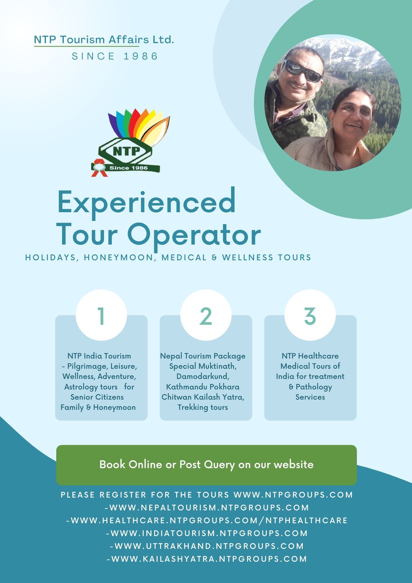 NTP born in the year 1986, established as a registered company at Daryaganj, New Delhi further expanded at Delhi's Corporate Hub The Connaught Place named its office as Theater of Tourism and at Kathmandu New Road, Darbar Marg Nepal, Idea behind Two Offices at the same time in Delhi and Kathmandu, has been to care 1st Tourists to N - Numbers through NTP logistics human resources for a fool proof care, it has excelled becoming a corporate Public Limited Co. in the Year 2000 further to advent as a Multinationals with offices reps at Gulf Europe, USA in the world of Tourism. NTP profile have had the strength of Prolific Directors * for Testimonial ref. Registrar of Company , Govt. of India and founding Directors profile in the "Article of Memorandum " , All the directors huddled to inculcate ethos for no profits intent but to priorities NTP guests and NTP cadre its cadre to ensure absolute dedication precession NTP itineraries of travel, tourism, adventures, organized managed events to name just few for the corporates, The Voltas, IMA Doctors with top Doctors, EIL Engineers, Convention of PR Directors Managers, Cricket Ajit Wadekar, WHO's WHO's Celebrities, Ambassadors and foreign dignitaries several conventions, College School groups to name A to Z NTP has the its own enriched data bank. Enthused Director Mr. Hemant K Sharma player of International repute, champion of Rowing and aquatics has further excelled the Company in association of Ms. Pooja, most learned Director of the company with several languages having travelled over destinations 10s and 100s of times personally escorted managed groups and families. Commended World - Wide, patronized by 1st Generation in 1986 to the Third Generation in 2022, it has been overwhelming trust with which company cruised with the Flagship NTP ensured Patrons are absolutely assured safe and taken best care of NTP trust emerges with the booking until conclude track the welfare 24x7 sleepless to ensure NTP guests sleep well enthuse through the tour. Since established in the days of no internet, yet we remained up and working for our patrons, prime co. through honest and hard work progressed as the most modern equipped networking Co. the NTP its online travel platform, garden of NTP has nursery for hundreds and thousands of travel associates and lacs of guests patrons, sailing with pride with unfazed uncompromising undeterred of honest quality governance.