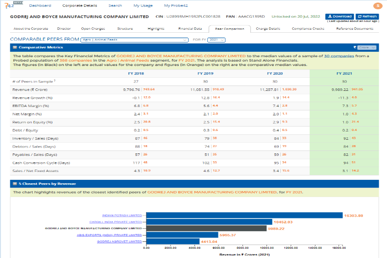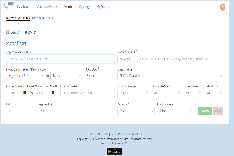 Probe42 Business is the single go-to platform for all your data needs. List of Data Points provided: • Company Coordinates and Company Status • List of Directors and their other directorships • List of Charges (Secured Lendings) • Shareholding details • Group Companies • Financial Statements (Balance Sheet and Profit and Loss Statements) and Financial Ratios • Peer Comparison • GST Details • Litigation Details • Credit Rating