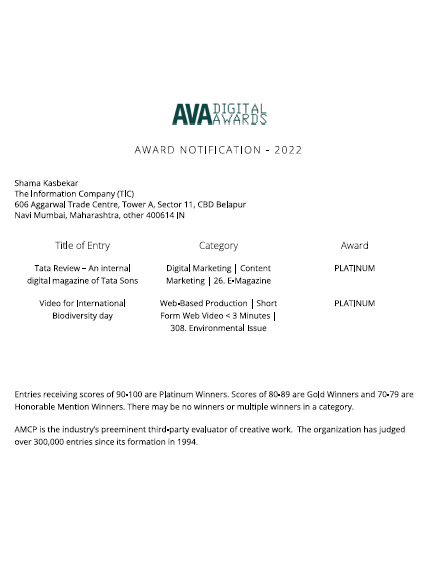 AVA Digital Awards - Platinum - Tata Review E-magazine